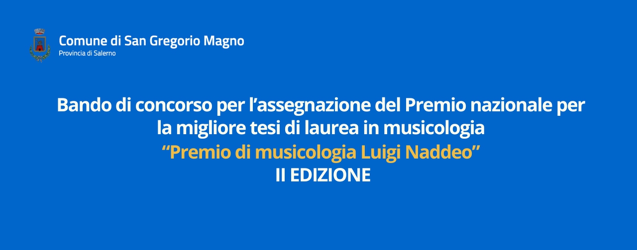 L’Assessorato alla Cultura del Comune di San Gregorio Magno (SA), in collaborazione con la Prof.ssa Enrica Donisi, docente di Storia della musica presso il Conservatorio “Umberto Giordano” di Foggia, bandisce la seconda edizione del Premio Nazionale di musicologia “Luigi Naddeo”, con l’obiettivo di valorizzare e premiare l’eccellenza nella ricerca musicologica in ambito accademico.