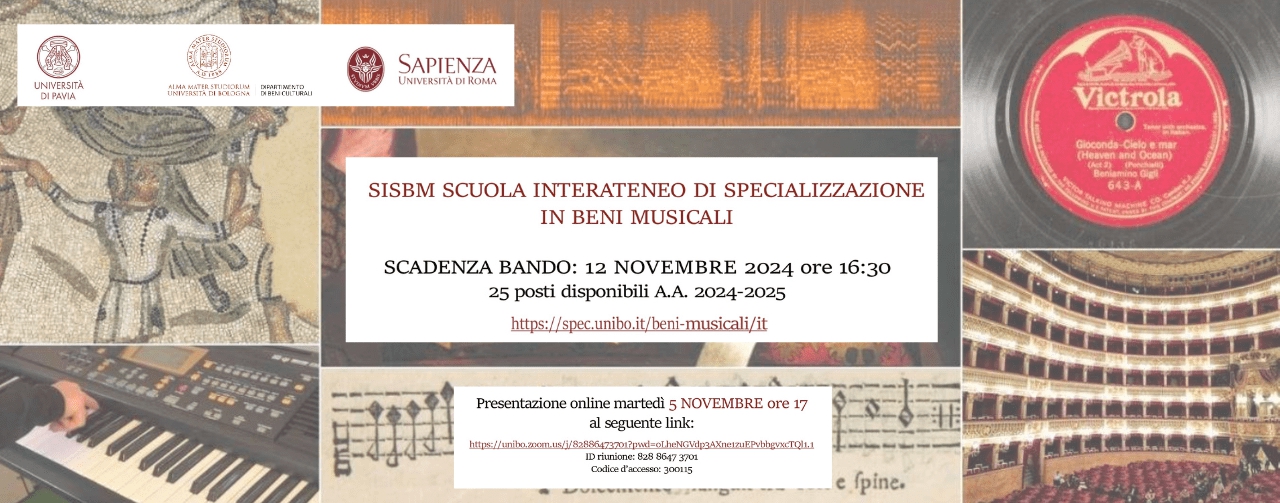 Martedì 5 novembre alle ore 17 ci sarà la presentazione della Scuola Interateneo di Specializzazione in Beni Musicali (SISBM) al seguente link https://unibo.zoom.us/j/82886473701?pwd=oLheNGVdp3AXne1zuEPvbbgvxcTQl1.1 [ID riunione: 828 8647 3701 Codice d’accesso: 300115]