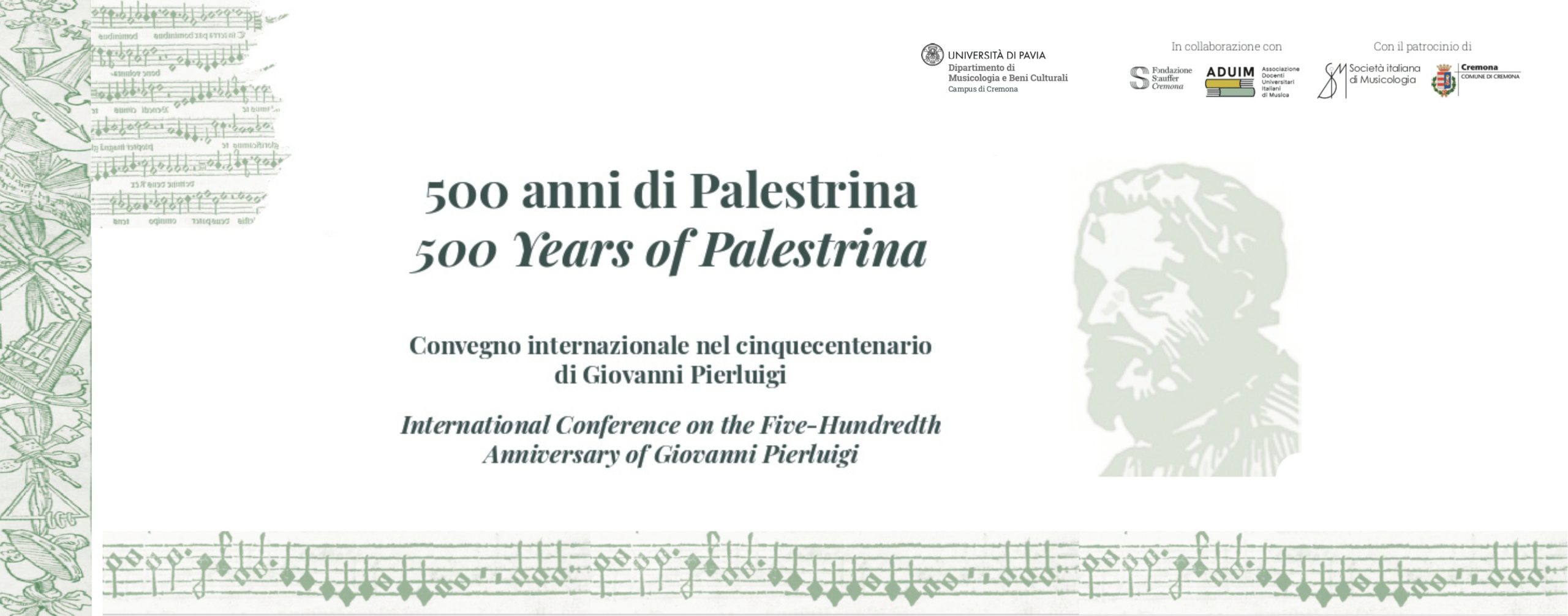 In occasione del cinquecentenario della nascita di Giovanni Pierluigi da Palestrina (1525-2025), il Dipartimento di Musicologia e Beni Culturali (Università di Pavia) e ADUIM, Associazione Docenti Universitari Italiani di Musica, organizzano un convegno internazionale intorno alla figura del grande musicista rinascimentale.