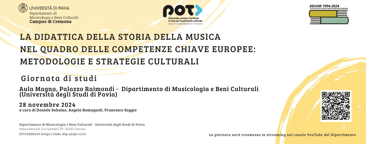 La giornata di studi La didattica della storia della musica nel quadro delle competenze chiave europee: metodologie e strategie culturali, prevista per il 28 novembre 2024 al Dipartimento di Musicologia e Beni Culturali dell’Università di Pavia – Campus di Cremona, si propone di investigare il rapporto tra la storia della musica, la sua didattica e il contesto delle competenze chiave: quali metodi, quali strategie innovative possono essere messe in campo per formare gli studenti in questo campo del sapere tanto importante, quanto poco approfondito nell’istruzione secondaria. La relazione tra didattica per competenze e l’acquisizione di un sapere storico sarà affrontato sotto diverse prospettive, da musicologi e docenti di storia della musica.