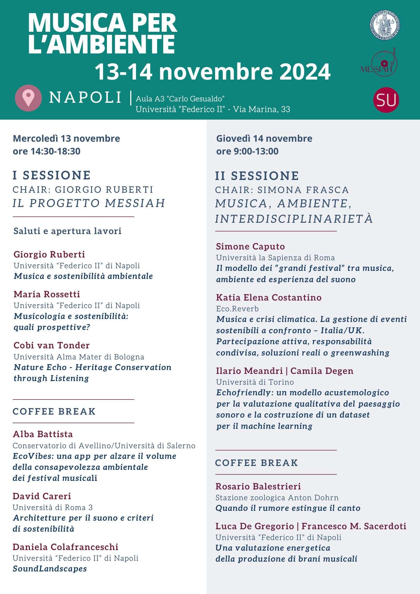Alle giornate di studi parteciperanno docenti e ricercatori di varie università italiane insieme a esperti del settore. La prima sessione, prevista per mercoledì 13 novembre alle 14.30 e moderata dal professor Giorgio Ruberti, docente di musicologia presso l’Università Federico II, includerà la presentazione del progetto M.E.S.S.I.A.H. (Music for the Environment: Sustainability Strategies against the Impact from the Awareness of History). Parleranno Maria Rossetti (Università Federico II), Cobi van Tonder (Università Alma Mater di Bologna) e Alba Battista (Conservatorio di Avellino), seguiti dagli interventi di David Careri (Università di Roma Tre) e Daniela Colafranceschi (Università Federico II).
