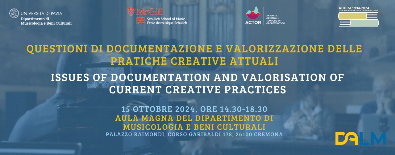 L’evento Questioni di documentazione e valorizzazione delle pratiche creative attuali si terrà il 15 ottobre 2024 al Dipartimento di Musicologia e Beni Culturali dell’Università di Pavia. L’iniziativa, organizzata in occasione del 30° anniversario dell’ADUIM, mira a discutere le metodologie e strategie per la documentazione e valorizzazione delle pratiche creative, senza distinzioni tra diversi generi musicali come musiche d’arte, d’avanguardia, popolari e tradizionali.