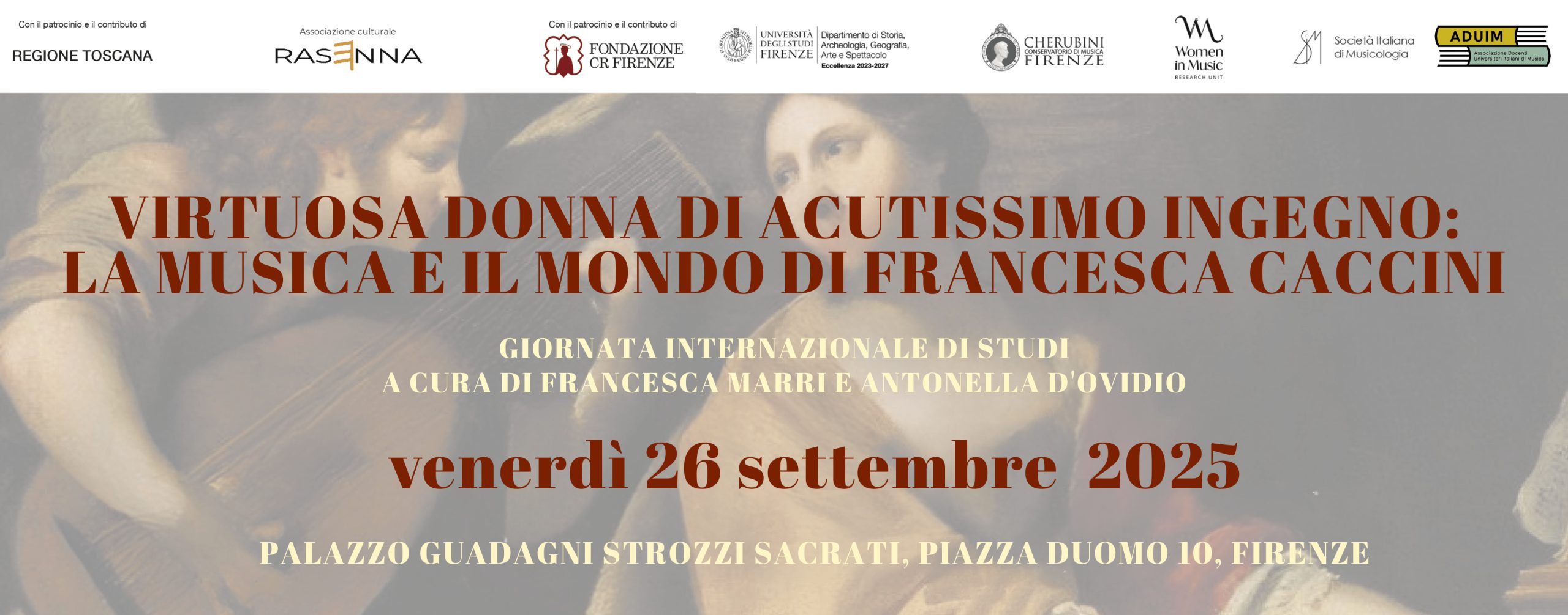 Si terrà venerdì 26 settembre 2025 al Palazzo Guadagni Strozzi Sacrati (Piazza Duomo 10 – Firenze) la giornata di studi dal titolo Virtuosa donna di acutissimo ingegno: la musica e il mondo di Francesca Caccini. L’iniziativa riunisce studiose e studiosi per approfondire il ruolo di questa straordinaria musicista nel panorama del Seicento.