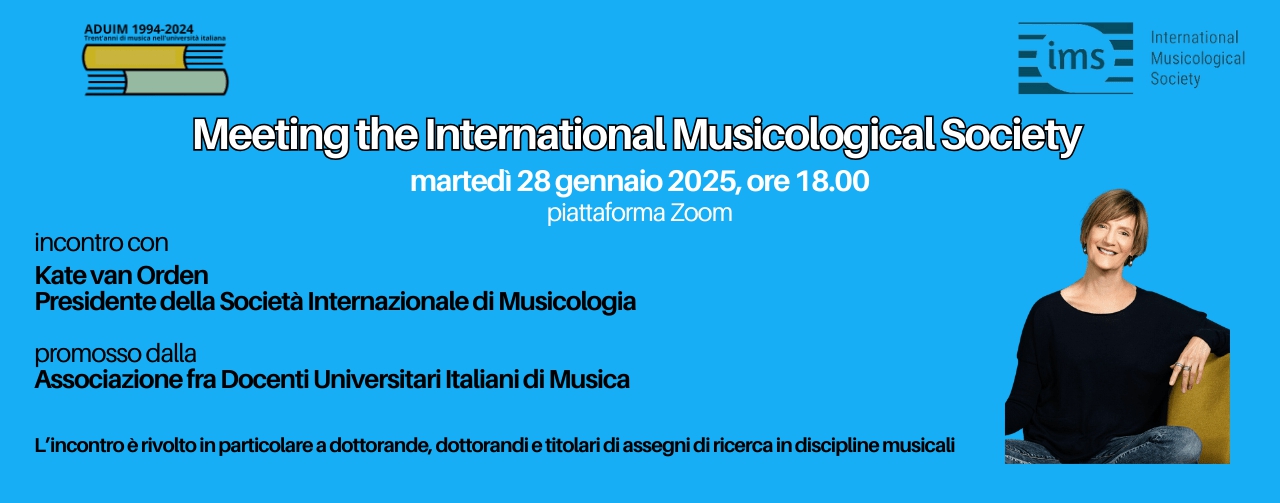 Il prossimo martedì 28 gennaio, alle ore 18.00 su piattaforma Zoom, l’ADUIM organizza un incontro online con la Presidente della IMS Kate van Orden, con lo scopo di far conoscere più da vicino ai giovani ricercatori e ricercatrici operanti in Italia le attività della Società Internazionale di Musicologia e le opportunità di partecipare, come membri della Società, a gruppi di studio e a reti di ricerca internazionali.