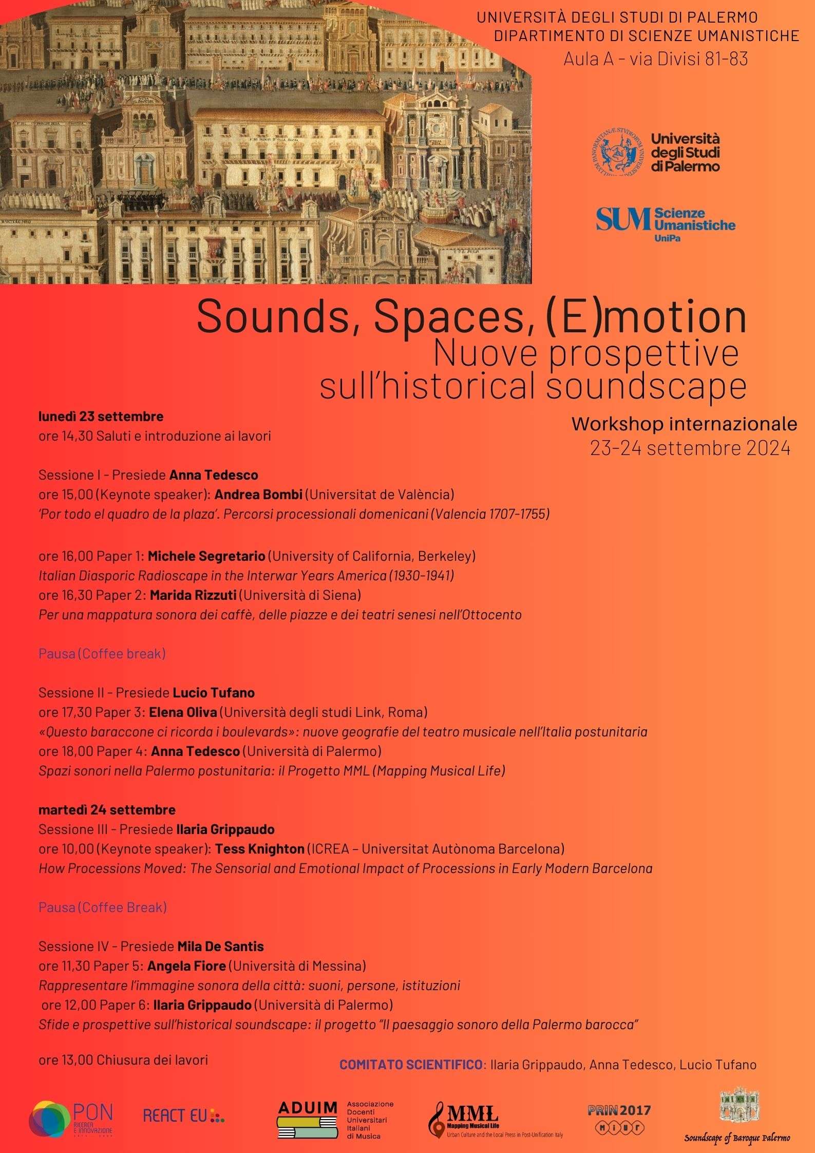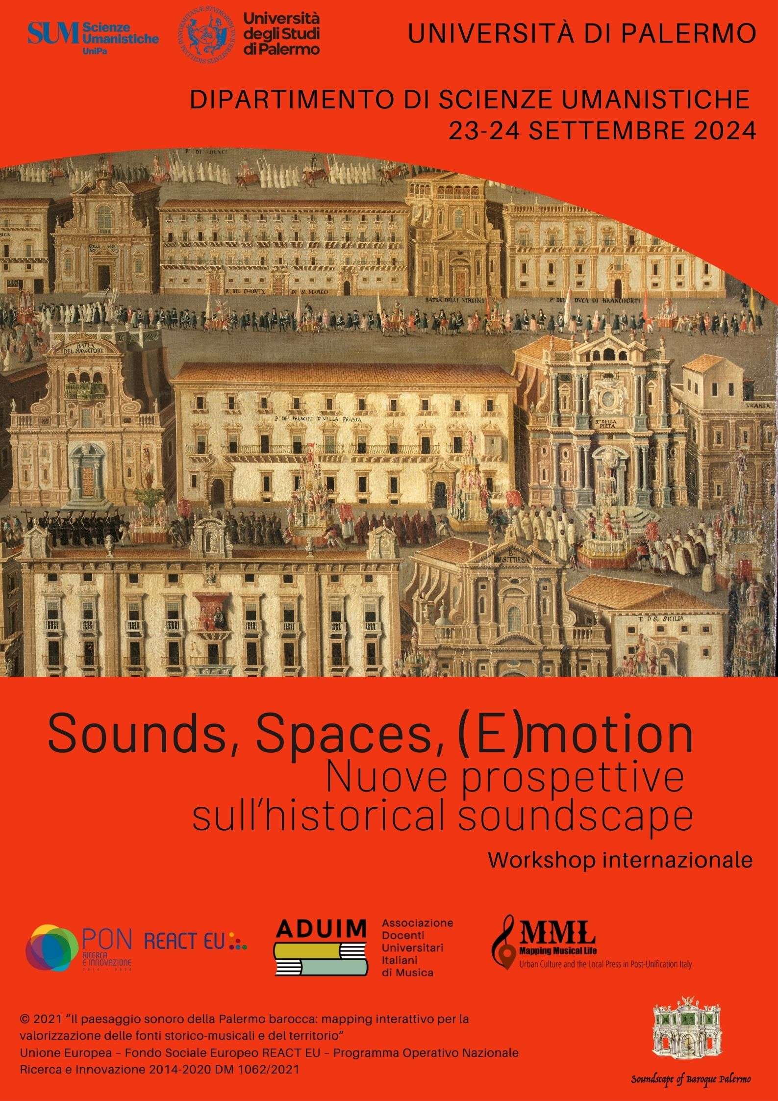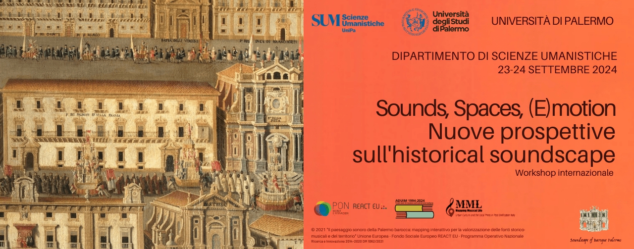 Il 23 e 24 settembre 2024, al Dipartimento di Scienze Umanistiche dell’Università di Palermo (aula A, via Divisi 81-83), si terrà il workshop internazionale Sounds, Spaces, (E)motion. Nuove prospettive sull’historical soundscape.